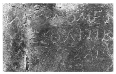 Detail of lines 2-4 of the slave’s lead tablet letter. Reproduced from David Jordan’s “A Personal Letter Found in the Athenian Agora,” Hesperia: The Journal of the American School of Classical Studies at Athens, Vol. 69, No. 1 (Jan. – Mar., 2000), pp. 91-103.